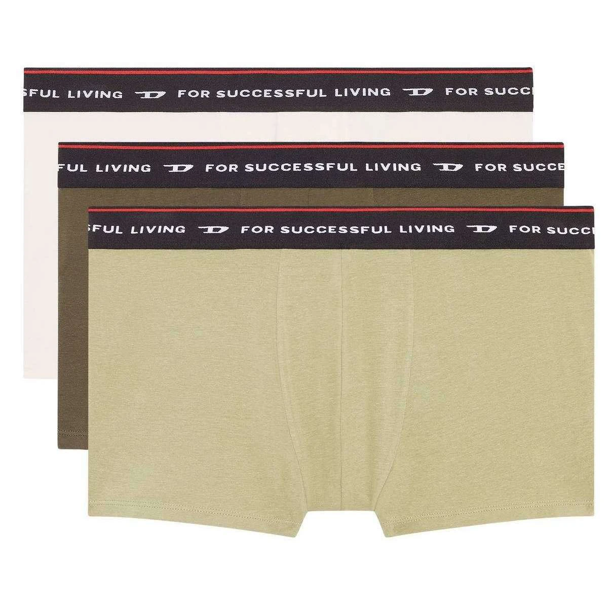 This men’s damien 3 pack boxer brief by the brand Diesel is made from 95% cotton and 5% elastane-spandex and is showcased in khaki. Also the white/khaki/green underwear is designed in a plain pattern, It is recommended to wash at 30 degrees on a delicate cycle, do not bleach, do not tumble dry, do not dry clean to keep this underwear in good condition. 3 pack underwear is value for money ensuring they are a good buy, All the underwear comes complete in diesel packaging. The Diesel Damien 3 Pack Boxer Brief – White/Khaki/Green has been made with stunning stretch cotton and designed with an elasticated waistband to ensure you are provided with premium comfort. They feature a simplistic design which doesn’t let you down on style, making them the ideal undies for whatever day lies ahead. Detailed with a repeated Diesel logo and ‘For successful living’ slogan they are the perfect base for your attire.