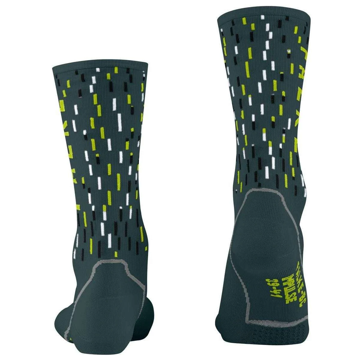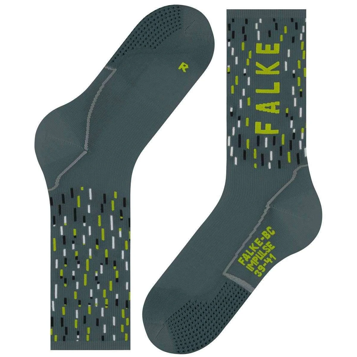 These bc impulse peloton socks for men or women are fashioned by the brand Falke in a grey colour and are made from 54% polyester (49% recycled), 41% polyamide and 5% elastane. Also the steel grey socks are designed in a unique pattern, It is recommended to wash at 40 degrees to keep these socks in good condition. All the socks come complete with falke sock tags. The Falke BC Impulse Peloton Socks – Steel Grey offer an innovative mesh kit that stimulates the receptors on the ball of the feet to minimise numbness, while keeping your feet cool and dry. These cycling socks have ultralight cushioning for direct control and speed. Thanks to the impulse technology, you have improved dynamics and better balance. With eye catching coloured strokes in the shaft, these socks are complete with optimal fit with toe and sole area adapted to each foot.