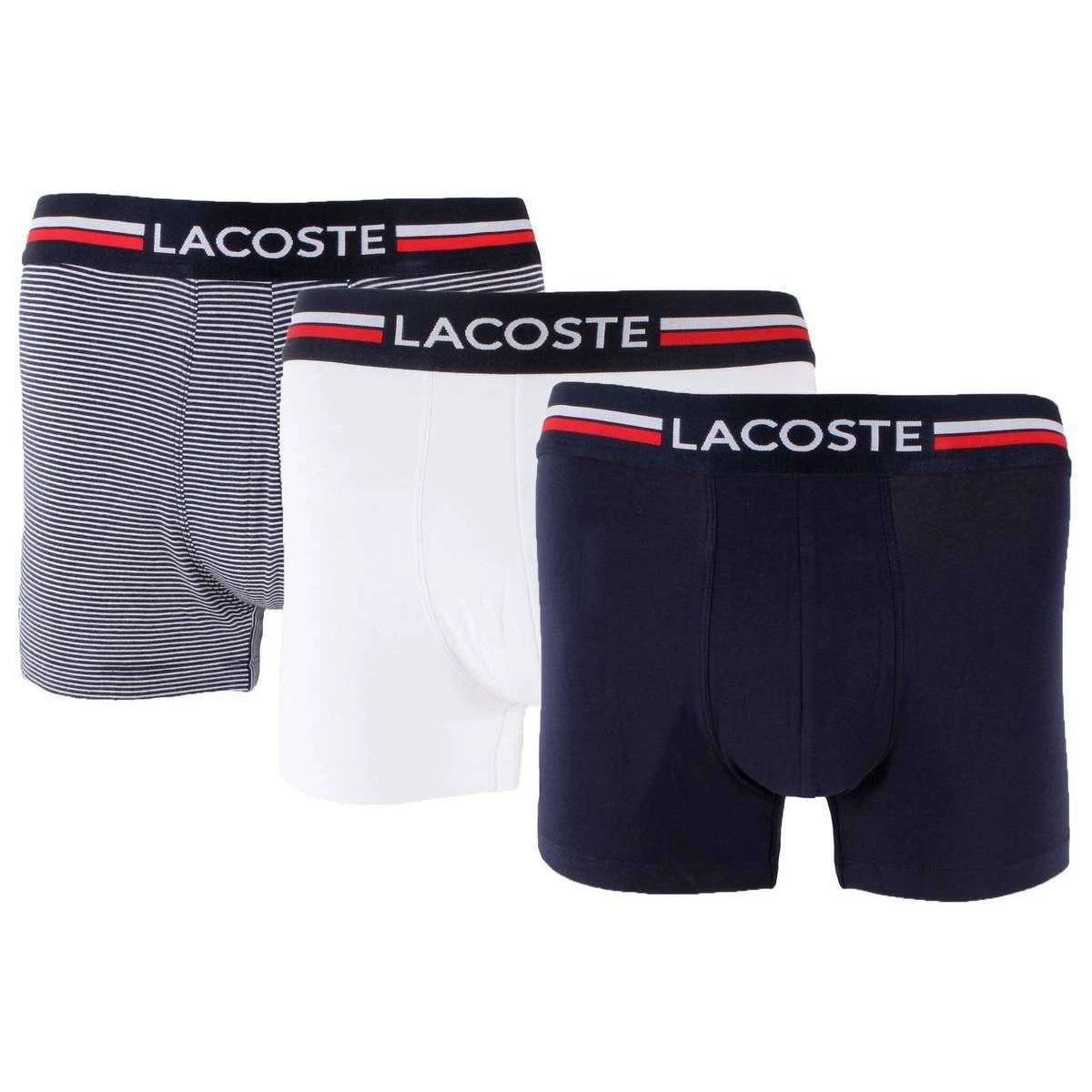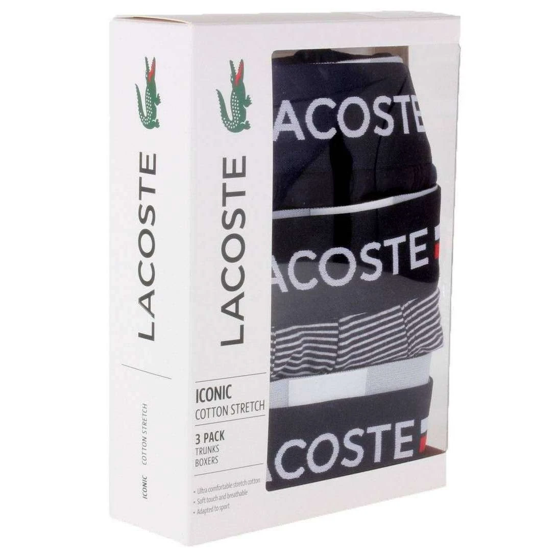 This men’s iconic 3 pack trunks by the brand Lacoste is made from 95% cotton and 5% elastane and is showcased in navy. Also the navy/white underwear is designed in a striped pattern, It is recommended to wash at 30 degrees to keep this underwear in good condition. 3 pack underwear is value for money ensuring they are a good buy, All the underwear comes complete in a lacoste presentation box. The Lacoste Iconic 3 Pack Trunks – Navy/White are an essential for any gentleman and have been made with soft and comfortable materials that will not disappoint. The elasticated three-tone waistband ensures a perfect fit and displays Lacoste lettering, and the iconic green crocodile logo is embroidered at the hem. These exceptional boxers provide all the comfort and style you need during day to day life.